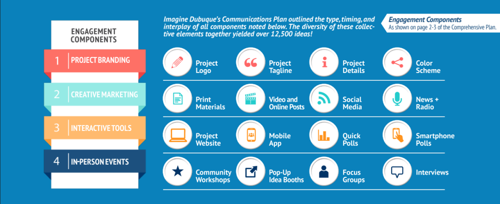 “Community engagement was the single-most pivotal and influential factor of Imagine Dubuque. The Plan’s findings and recommendations, showcased in the chapters that follow, are directly derived from the engagement process, as celebrated by the infographics and outreach statistics therein. Only through the participation of the community was the City capable of developing a relevant and meaningful plan for the future of Dubuque.” – Imagine Dubuque (page 2-9)