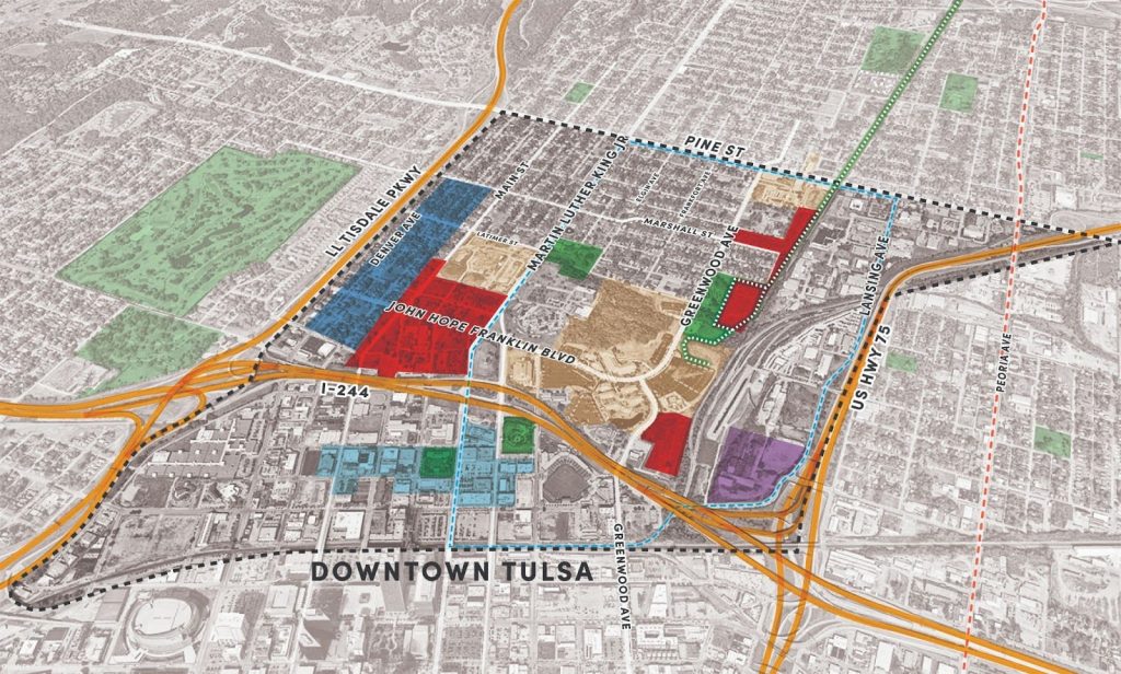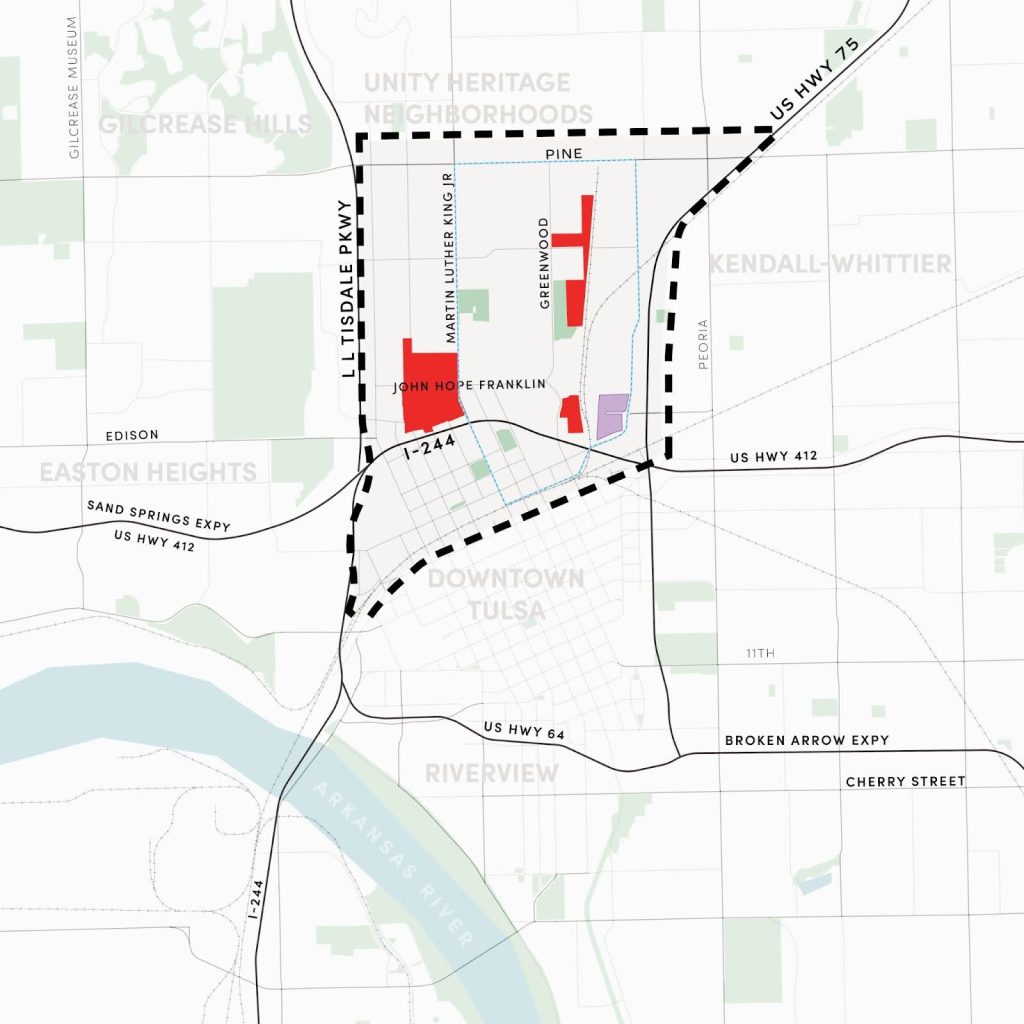 The Kirkpatrick Heights/Greenwood Master Plan was developed under the leadership of the City of Tulsa and Partner Tulsa, the city’s economic and community development organization, and is now being implemented under the leadership of the Greenwood Legacy Corporation (GLC), a purpose-built Community Development Corporation. The master plan defines the community’s vision and creates a framework for development of three publicly owned, underutilized sites within the context of the historically black Kirkpatrick Heights/Greenwood neighborhood. Many of these residents are descendants of Tulsa’s Black Wall Street, victims of the horrific 1921 Tulsa Race Massacre, and have been impacted by decades of disinvestment following urban renewal and red lining. The plan’s development coincided with the centennial of the 1921 Massacre and leverages the public acquisition of the underutilized sites in 2018.