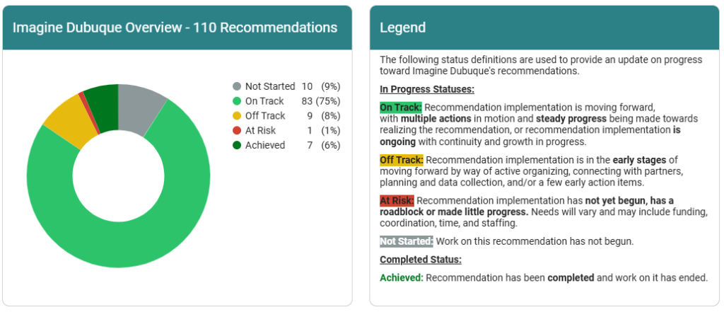 In Imagine Dubuque’s final chapter, “A Call to Action,” Dubuque outlines responsibilities for discrete projects and initiatives with assignments for relevant city offices and departments. The chapter identifies the roles of different partners across sectors within the city including those in sustainability, support services, education, community care, business, and governance. Each recommendation/initiative is then matched to the requisite partners in the chapter, fostering the development of strong connections across the community to enable effective implementation. Since then, the City has converted the plan’s original website from one geared towards gathering feedback to one that highlights implementation progress. Today, community members and partners can find a regularly updated implementation dashboard that is broken down in accordance with the plan’s seven categories and each of the 110 recommendations. The dashboard is an intentional effort to increase transparency in Imagine Dubuque and foster a dialogue between City Hall and residents on the plan’s successes, as well as its setbacks or needed changes.